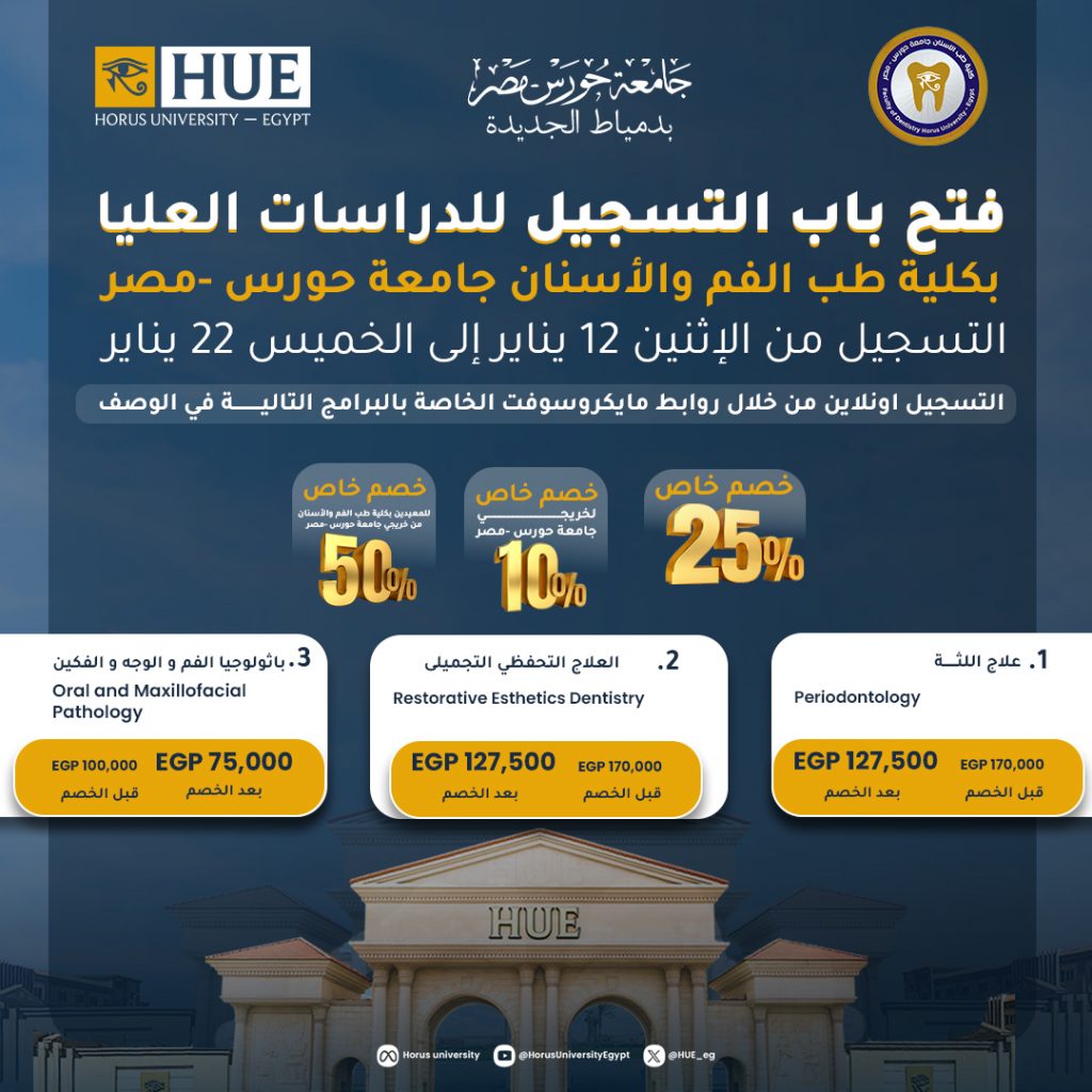 تعلن كلية طب الفم والأسنان – جامعة حورس – مصر عن فتح باب التسجيل ببرامج الدراسات العليا (الماجستير) للعام الجامعي 2025-2026