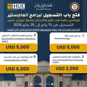 التهنئة والتقدير إلى كلية طب الفم والأسنان بجامعة حورس بمناسبة حصولها على موافقة وزارة التعليم العالي والبحث العلمي على بدء الدراسة ببرنامج الماجستير بالكلية